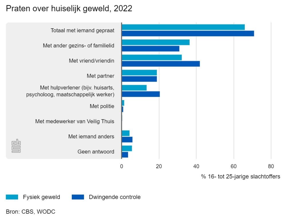 De meeste jonge slachtoffers van fysiek geweld en dwingende controle gaven aan met iemand hierover gepraat te hebben, vooral met andere gezins- of familieleden of met vrienden/vriendinnen. Bij beide vormen van huiselijk geweld praatte iets minder dan 20 procent erover met hun partner. Hulpverleners, zoals een huisarts of psycholoog, werden relatief vaak opgezocht, bij dwingende controle iets vaker dan bij fysiek geweld (21 tegen 14 procent van de slachtoffers). Jongeren vonden minder vaak hun weg naar medewerkers van Veilig Thuis of de politie: hiermee praatte rond de 1 procent van de slachtoffers.Bron: CBS, WODCTotaal met iemand gepraatMet ander gezins- of familielidMet vriend/vriendinMet partnerMet hulpverlener (bijv. huisarts,psycholoog, maatschappelijk werker)Met politieMet medewerker van Veilig ThuisMet iemand anders