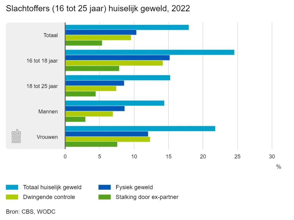 In 2022 zei 18 procent van de jongeren tussen 16 en 25 jaar dat ze in de afgelopen twaalf maanden slachtoffer waren van huiselijk geweld. Dat zijn ruim 350 duizend jongeren. Het gaat niet alleen om fysiek geweld, maar ook om andere vormen van geweld zoals dwingende controle door gezinsleden en stalking door een ex-partner. De meeste slachtoffers praten met iemand over wat hen overkomen is, maar doen dit nauwelijks bij instanties zoals de politie of Veilig Thuis. Dit meldt het CBS.De cijfers zijn afkomstig uit de Prevalentiemonitor huiselijk geweld en seksueel grensoverschrijdend gedrag 2022, een enquête-onderzoek van het CBS en het Wetenschappelijk Onderzoek- en Datacentrum (WODC). Ruim 24 duizend inwoners van Nederland van 16 jaar of ouder namen deel aan het onderzoek, waarvan 2 duizend jongeren tussen 16 en 25 jaar.